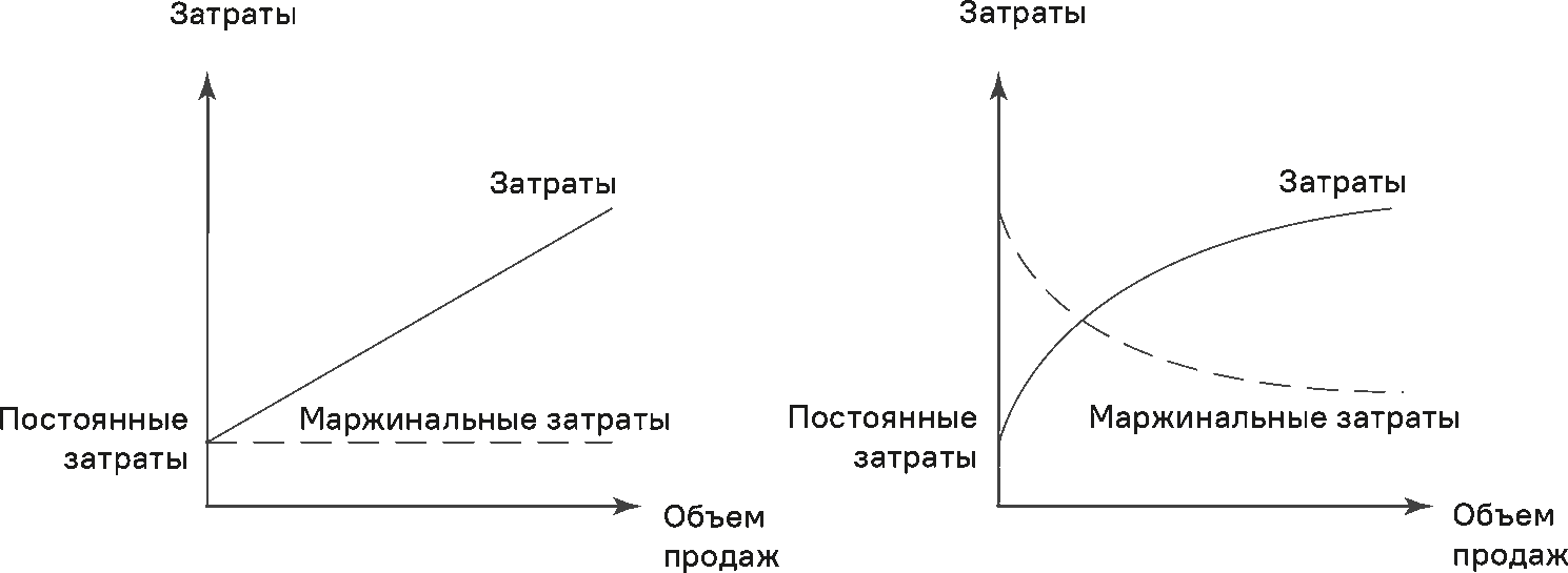 С точки зрения ценовых решений самый важный аспект стоимостного анализа – это умение четко разграничить постоянные и переменные затраты. Постоянные затраты по определению не зависят от объема производства, а переменные затраты от него зависят. В отличие от функции «цена-отклик», функцию издержек определить проще, поскольку необходимую информацию можно получить внутри компании. Функции издержек можно классифицировать по критерию поведения маржинальных затрат. Маржинальные затраты показывают, как изменяются затраты при возрастании или уменьшении объема производства на одну единицу, то есть изменяются с приращением. На практике чаще всего встречаются две формы: линейная стоимостная функция с постоянными маржинальными затратами и плавно нарастающая «вогнутая» функция затрат. На рис. 3.2 показаны примеры стоимостных функций с постоянными и снижающимися переменными затратами.