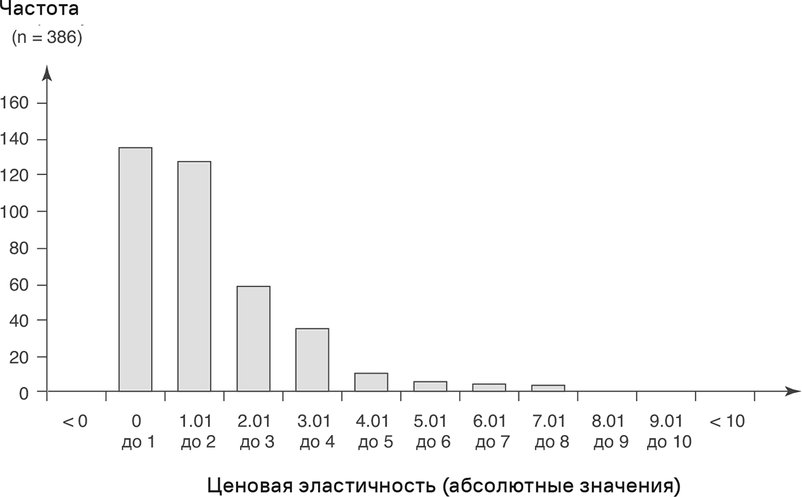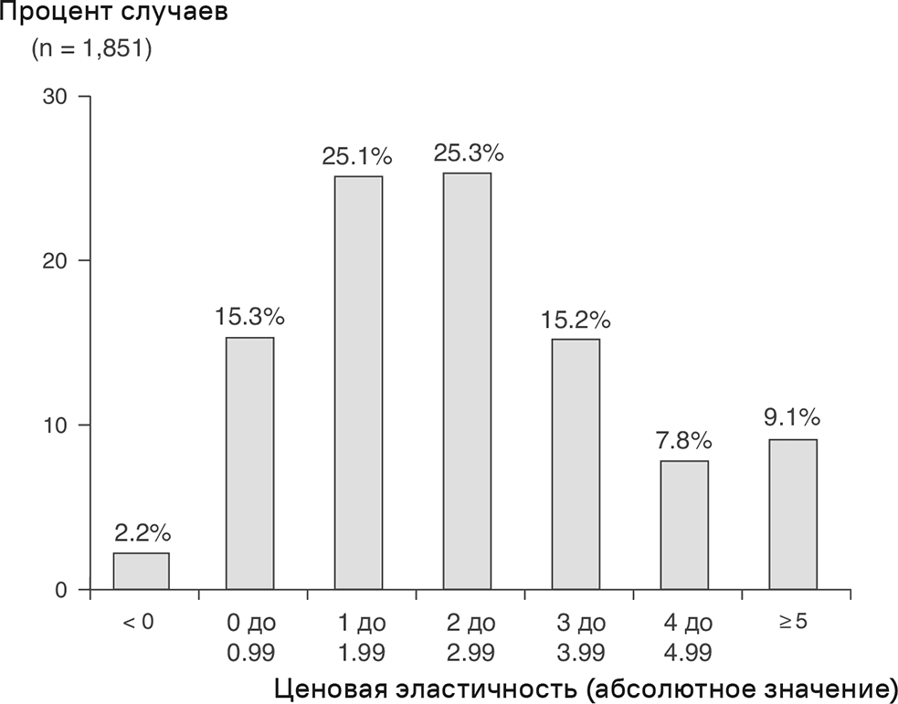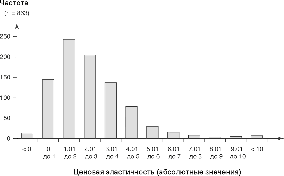 В то время как данные по ценовой эластичности, собранные Bijmolt et al. [16], датируются годами с 1961-го по 2005-й, значения, показанные на рис. 3.9, основаны на более позднем метаанализе Friedel [18], чья работа представляет собой наиболее всеобъемлющую оценку эмпирической информации по ценовой эластичности на сегодняшний момент. В первом исследовании Фридель проанализировал 863 эмпирических значения, взятых из научных журналов с 1981 по 2006 годы. Ценовые эластичности из этой части метаанализа Фриделя дают среднее значение 2,51 и медианное 2,21. Совпадение между анализом Фриделя и выводами Bijmolt et al. [16] большое.