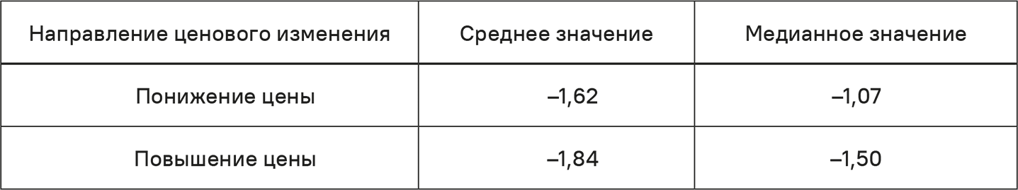 Наконец, работа Фриделя [18] содержит дальнейшие выводы о воздействии повышения и понижения цен на основе набора данных Simon-Kucher & Partners. В табл. 3.3 мы видим средние и медианные значения 386 ценовых эластичностей при повышении и понижении цен. Средняя ценовая эластичность для снижения цен равнялась –1,62, для повышения –1,84. Медианная ценовая эластичность равнялась –1,07 для понижения цены и –1,50 для повышения. Согласно этим наблюдениям, объемы продаж сильнее реагируют на повышение, а не на понижение цен. Это расхождение можно объяснить различиями в моделях реагирования конкурентов.