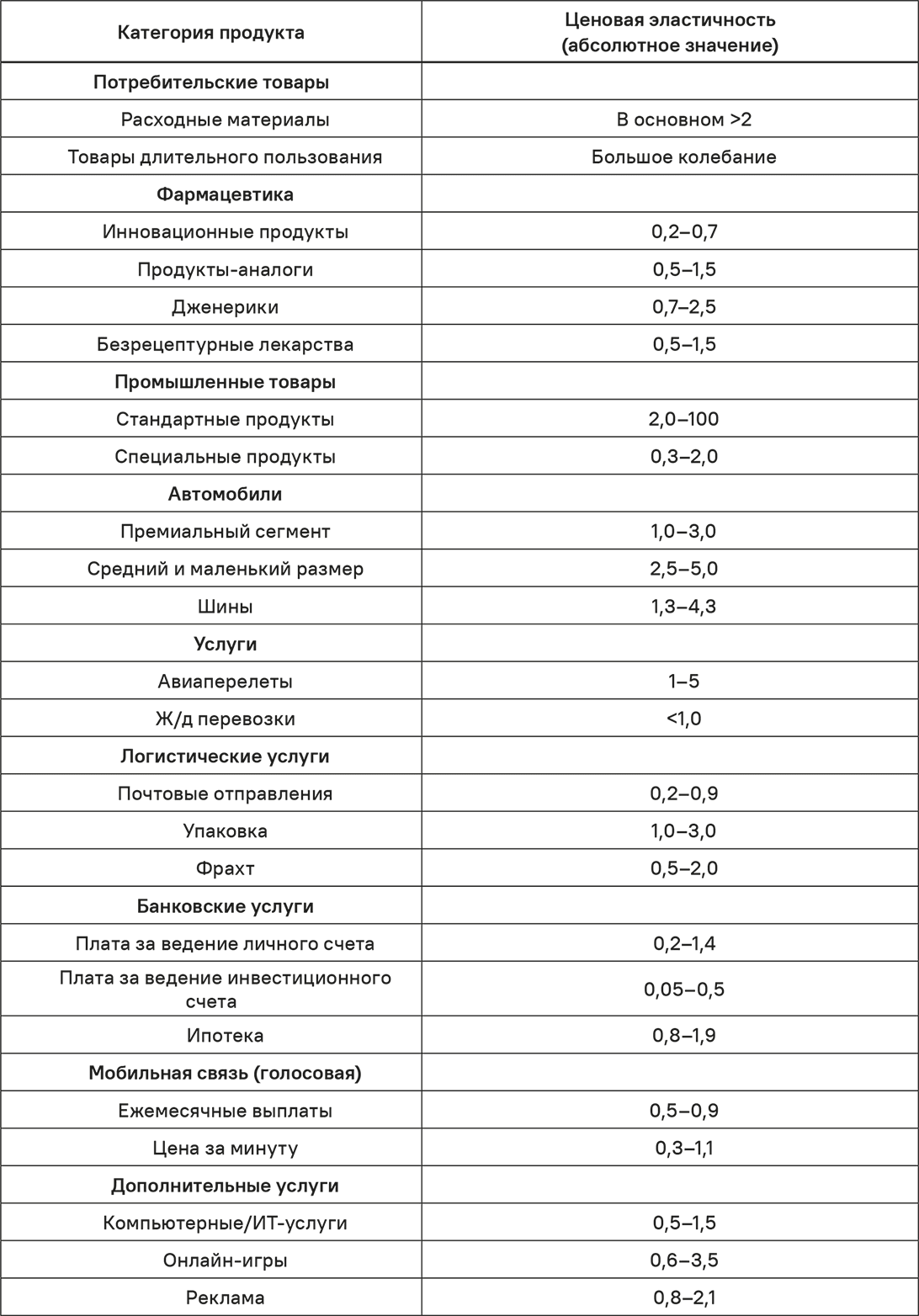 В некоторых случаях можно видеть очень высокие значения ценовой эластичности. В качестве примера можно привести марку сигарет, снижение цены на которую на 13,2 % обеспечило рост рыночной доли на 1300 %. Это соответствует значению абсолютной ценовой эластичности – почти 100. Для промышленных товаров разброс тоже может быть велик. В опросе производителей машинного оборудования респонденты оценивали свою ценовую эластичность значительно ниже единицы. В опросе экспертов компании – поставщика сырья респонденты ожидали, что повышение цены на 2 % вызовет падение объема продаж на 50 %. Это дает абсолютную ценовую эластичность 25.