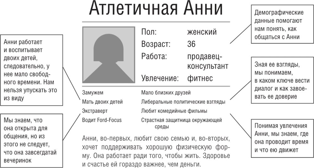 Все пять видов разбиения на целевые группы, перечисленные выше, помогут нарисовать обобщенные портреты покупателей (personas)[15]. Пример можно увидеть на рисунке 1.3. Это эффективное описание ваших сегментов. Большинство компаний рисуют от пяти до десяти обобщенных портретов покупателей, потому что если их слишком мало, то они описывают чересчур большие и общие сегменты, а если их слишком много, то сегменты чересчур малы и подход становится излишне индивидуальным.