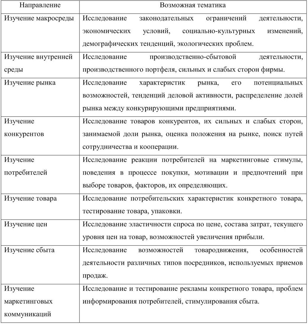 Направление маркетинговых исследований зависит от конкретных условий: ситуации на товарном рынке, уровня конкуренции на рынке, наличия входных барьеров на рынок, маркетинговой стратегии предприятия. Значительная часть отечественных производственно-сбытовых и торговых предприятий проводит маркетинговые исследования по следующим направлениям: оценка рыночной ситуации, краткосрочные и среднесрочные прогнозы основных параметров рынка, изучение поведения покупателей и конкурентов, характеристика уровня и динамики цен и т.п., а также оценка собственного потенциала. Типичные направления маркетинговых исследований представлены в таблице 5.