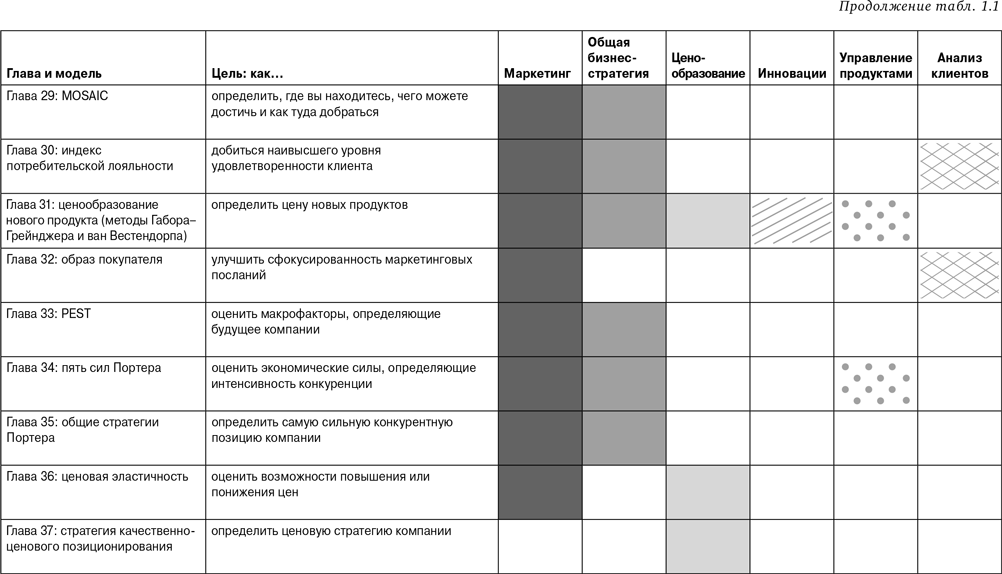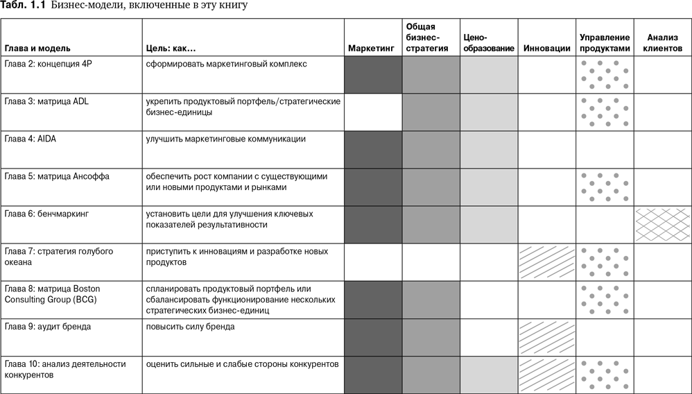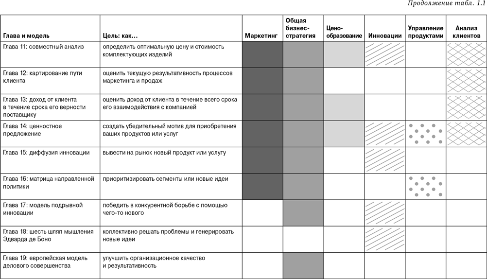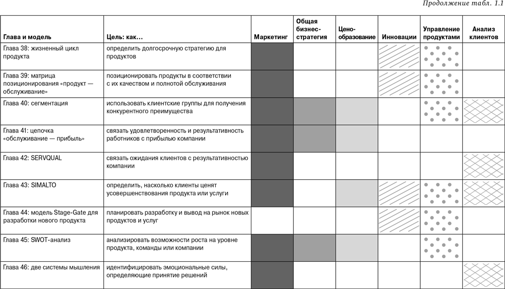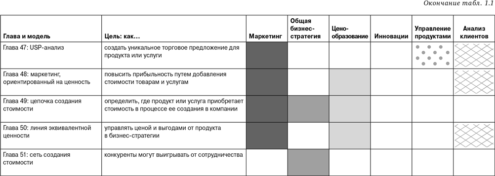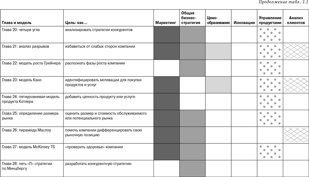 Знать, какую модель следует выбрать, – всего лишь половина дела. В какой-то мере простор выбора ограничивается типом проблемы, которая стоит перед вами. Вам нужна помощь в создании нового продукта? У вас возникли новые конкурентные угрозы? Вы разрабатываете общую стратегию для бизнеса? Можно сразу перейти в соответствующую категорию и посмотреть, какая модель подходит больше всего. В книге рассмотрены 50 наиболее популярных бизнес-моделей. Все они перечислены в табл. 1.1 по главам с указанием основной области применения: маркетинг, разработка общей бизнес-стратегии, ценообразование, инновационная сфера, управление продуктами и анализ клиентов. Многие модели могут применяться в нескольких областях.