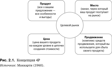 Старая поговорка гласит, что маркетинг – это продажа правильного продукта по правильной цене в правильном месте с помощью правильных средств продвижения. Концепция 4P (Product, Place, Price, Promotion) (рис. 2.1) – не более чем развитие этого упрощенного представления. На рисунке представлены четыре основных компонента маркетингового комплекса.