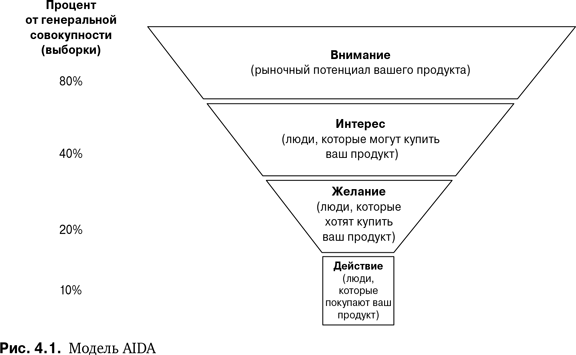 Модель AIDA (Awareness, Interest, Desire, Action) (рис. 4.1) – одна из самых известных в мире коммуникаций. Ее широко используют в сфере рекламы и продвижения для повышения эффективности коммуникаций в четыре этапа. Как и любая другая маркетинговая модель, AIDA должна быть нацелена на конкретную аудиторию, которая заинтересована в приобретении определенного продукта.