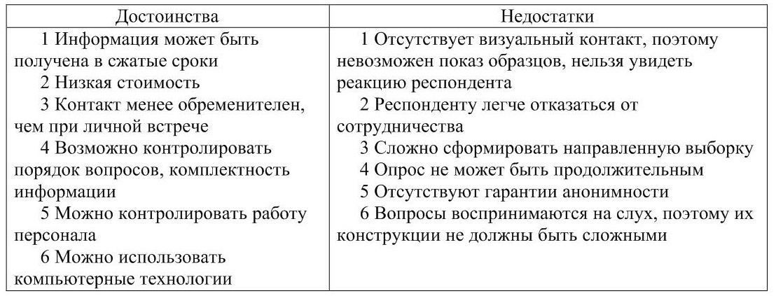 Поскольку телефонная связь – повсеместное ныне явление, телефонные исследования зачастую заменяют личные собеседования, главным образом по причине скорости и дешевизны. Телефон незаменим, когда надо получить небольшие объемы высокоструктурированной информации (несколько вопросов) на большой территории, но он не подходит для людей, не склонных отвечать по телефону, для детей или для тех, кто по телефону практически недоступен.
