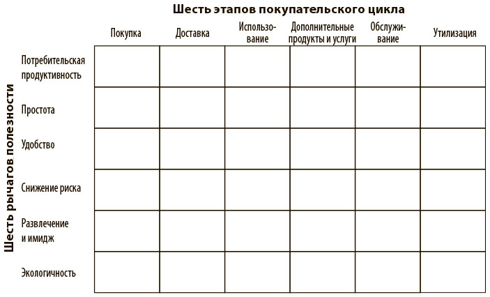 Шесть рычагов полезности. Этапы покупательского цикла пересекаются с тем, что мы называем рычагами полезности, – с их помощью компании могут создать для покупателя исключительную ценность. Шесть рычагов полезности отмечены на вертикальной оси, что дает 36 возможных вариантов, или ниш, полезности. В некоторых случаях (таких как простота, развлечение и имидж, экологичность) полезность, которую обеспечивают рычаги, очевидна. Мысль, что направление бизнеса или продукт способны снизить финансовый, физический или репутационный риск клиента, также понятна. А удобство продукта связано лишь с тем, что его легко приобрести или использовать. Чаще других применяется такой рычаг, как потребительская продуктивность. Она указывает, насколько эффективно продукт способен удовлетворять нужды потребителей на каждом этапе покупательского цикла, помогая экономить время, силы и (или) деньги. Интересно, что отрасли склонны фокусироваться лишь на небольшом подмножестве этапов и лишь на небольшом подмножестве шести потенциальных рычагов полезности, упуская из виду широкие возможности всей совокупности рычагов.