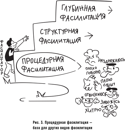 Базовую ступень фасилитации я предлагаю назвать «процедурной». Процедурный фасилитатор помогает группе преодолеть барьеры первого уровня, связанные с трудностями при формулировании мыслей и привнесением в разговор эмоций. Для этого он решает следующие на первый взгляд сравнительно простые задачи: