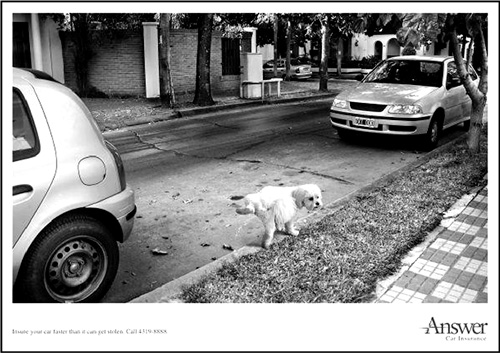 Смотрите, очаровательный соседский пуделек еще не закончил задирать ножку, а вашей машины уже не стало. Заголовок гласит: «Застрахуйте автомобиль до того, как его у вас уведут» (рис. 23).