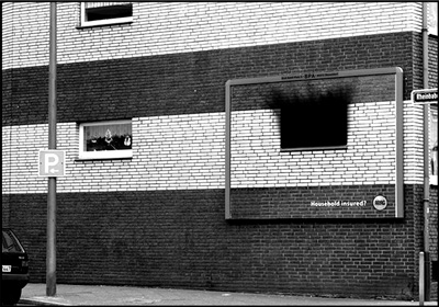 Как подтолкнуть жильцов многоэтажки к страхованию своих хор?м? Роль осколков стекла теперь исполняют чернота и копоть сгоревшей квартиры. Для этого в наружной рекламе пришлось специально имитировать окно и часть кирпичной стены (рис. 27).