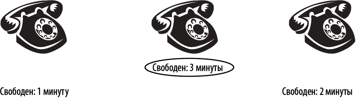 В соответствии с принципом «горячего места» система по порядку перебирает операторов: первый, второй, третий и т. д., до тех пор пока не обнаружит свободного. Как только система находит незанятого оператора, она сразу же направляет к нему звонок абонента. Более совершенный алгоритм MIA подразумевает, что система сначала проверяет всех операторов, находит среди них наиболее свободного и только тогда, после, повторяю, просмотра каждого оператора, направляет вызов к выбранному сотруднику (рис. 4.1).