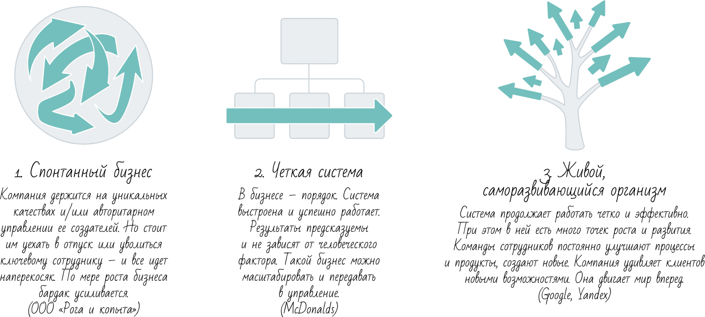 В несистемном бизнесе все держится на ключевых людях, они работают день и ночь, не могут надолго уйти в отпуск, устают и выгорают. Многие решения принимаются интуитивно, каждый раз как заново. Люди и подразделении работают неслаженно. Такой бизнес может быть успешным на начальном этапе, но по мере роста управлять им все сложнее – он становится менее эффективным. Все растущие компании проходят через это, часто неоднократно. Та или иная степень хаоса есть в любой компании, в том числе с тысячами сотрудников.