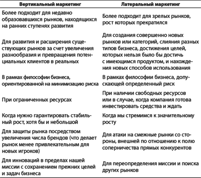Таблица 5.1. Сопоставление ситуаций, в которых предпочтительно использовать вертикальный или латеральный маркетинг