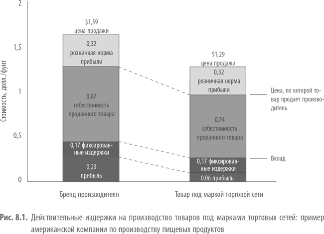 В плане проблем, связанных с доводом о прибыльности, очень показателен наш опыт работы с компанией по производству напитков. Вице-президент по маркетингу утверждал, что производство товаров под марками торговых сетей приносит компании прибыль. Однако главный бухгалтер возражал, что это верно только в том случае, если все фиксированные издержки (амортизация, текущий ремонт, некоторые трудовые затраты) распределялись бы только между собственными брендами компании. Так как компания занималась производством товаров под марками торговых сетей уже не первый год, это начинало терять смысл с точки зрения бухгалтерского учета (или с точки зрения разумного ведения бизнеса). Когда издержки были должным образом распределены, производство товаров под марками торговых сетей приносило компании убытки, а не доходы, и компания оплачивала производство товаров под марками торговых сетей в ущерб собственным брендам! Такую же ситуацию мы наблюдали в других компаниях. И это не учитывая, что из-за товаров под марками торговых сетей падают продажи собственных брендов производителей.