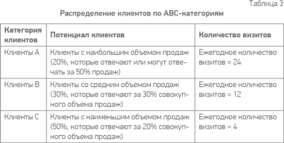 В результате АВС-анализа клиенты распределяются по трем-четырем категориям, обозначенным буквами «А», «В», «С» (табл. 3). Клиенты с наибольшим потенциалом традиционно распределяются в категорию «А», в то время как обладающие средним потенциалом заказы попадают в категорию «В».