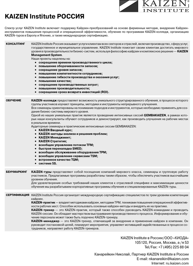 KAIZEN Institute – глобальная организация, действующая в Европе, Африке, Азиатско-Тихоокеанском регионе и Америке. KAIZEN Institute оказывает услуги по консультированию, обучению, сертификации и бенчмаркингу в области кайдзен и Lean (бережливое производство). В 26 региональных офисах KAIZEN Institute работают более 400 консультантов, обеспечивающих клиентов в любом регионе мира знаниями и опытом международного масштаба.
