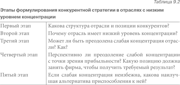 Рассмотренная выше совокупность идей дает возможность очертить общую аналитическую схему формулирования конкурентной стратегии в слабо концентрированных отраслях (см. табл. 9.2). Первый этап состоит в проведении полного анализа отрасли и конкурентов с тем, чтобы выявить источники конкурентных сил, внутреннюю структуру отрасли и позиции основных конкурентов. На этом анализе основан второй этап, состоящий в выявлении причин низкого уровня концентрации в отрасли. При этом важно определить все причины и установить их связь с экономикой отрасли. Если анализ показывает, что слабая концентрация не имеет фундаментальной экономической основы, это, как уже отмечалось, является важным выводом.