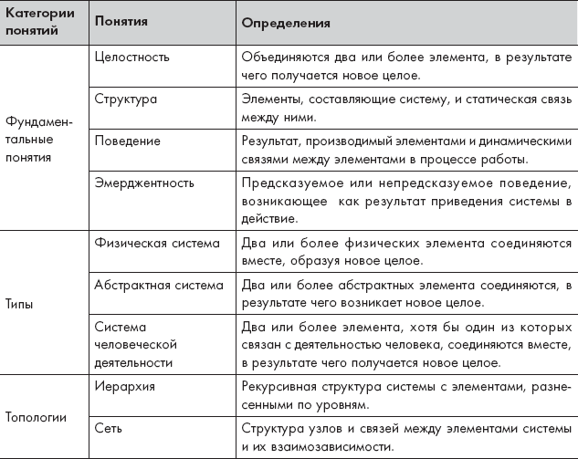В табл. 1.4 дается классификация понятий, которые были представлены в этой главе, и их определения. Такие категории, как фундаментальные признаки, типы, топология, центр внимания, сложность и роль, отражают важнейшие, существенные свойства систем.