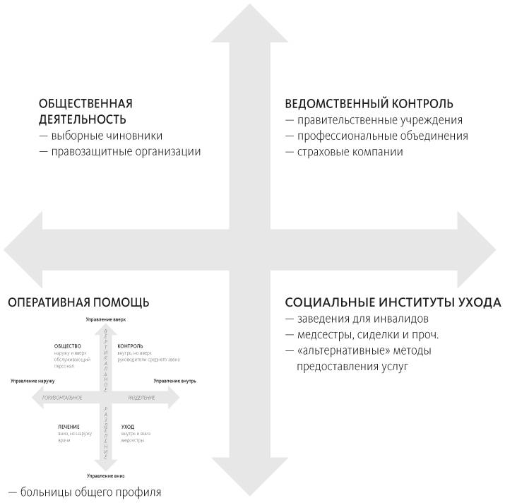 Затем мы с Шоломом нарисовали еще один крест, чтобы представить систему здравоохранения в более общих чертах (рис. 3). Весь стационар (уменьшенный вариант рис. 2) поместили в левую нижнюю четверть рисунка, представляя оперативную помощь – вниз внутрь в смысле лечения, но наружу в смысле трудностей при прямом контроле. Рядом с ним, вниз, но внутрь, расположили социальные институты ухода, в виде первичной врачебной медико-санитарной помощи, собственно медицинского ухода, заведений для инвалидов и т. п. Вверх и внутрь, вверху справа, действует ведомственный контроль, будь то страховые компании или правительственные учреждения и комиссии, а также профессиональные объединения, контролирующие работу своих членов. И наконец, вверх и наружу, слева вверху, оказалась общественная деятельность любого рода: это неформальные участники процесса.