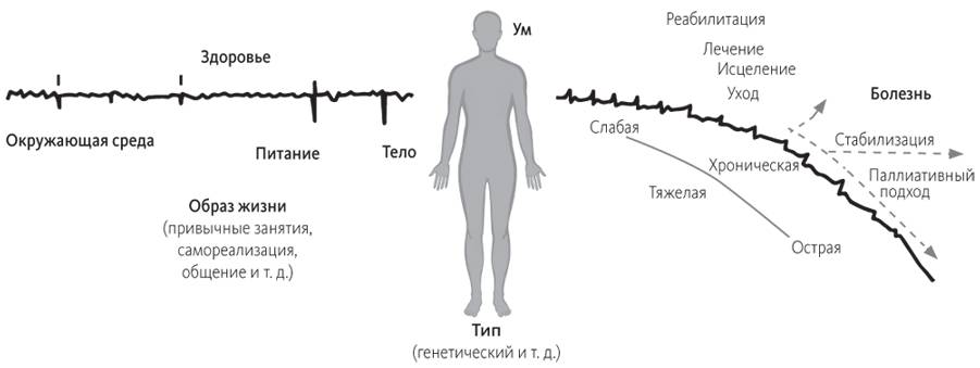 В центре схемы изображен человек: это вы или я, и не просто в виде ума и тела, но еще и с учетом души и индивидуального типа (точнее, того, как вы реагируете на тот или иной вид лечения). Слева – различные способы укрепления здоровья (санитарные нормы и гигиена, образ жизни, питание), а справа – разные формы болезни (от легкой до тяжелой, хронической и острой). Также я постарался показать цели вмешательства в наше состояние (исцеление, лечение, уход, реабилитация, стабилизация и паллиативный подход).