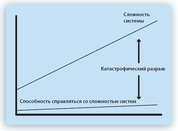 Исторически темпы роста сложности систем увеличивались с течением времени. В то же время наша способность в каком-то смысле постичь (или даже осознать) растущую сложность не повышалась с такой же скоростью. Кристер Йадерлунд (Christer J?derlund), шведский ученый, известный своими работами в области системного мышления назвал разницу между ростом сложности систем и нашей способностью справляться с этой сложностью катастрофическим разрывом, как показано на рис. 1.14.