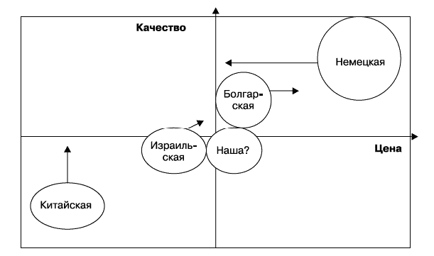Была проведена также информационно-разведывательная работа для определения намерений основных конкурентов. Болгары не собираются вкладываться в качество, но планируют поднять цены на некоторые марки продукта. Израильтяне решили повышать качество и цены параллельно. Впрочем, на рис. 2.23, где величина круга означает объем продаж, видно, что не болгары и Израиль наши основные конкуренты.