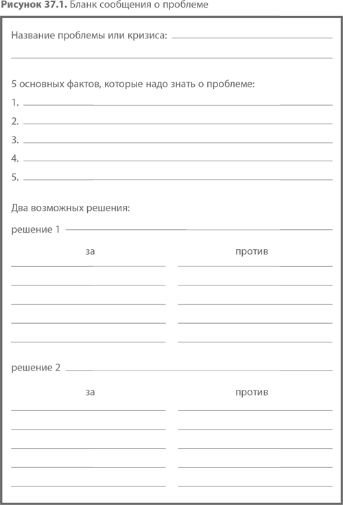 Во время оно у меня на руках было 47 служащих проблемной компании, где ежечасно случался какой-нибудь кризис. Постепенно я научил людей не врываться с новой проблемой без базовой информации, необходимой мне для принятия разумного решения, и без трех возможных вариантов выхода из положения. Я придумал шаблон сообщения, примерно такой, как на рисунке 37.1.
