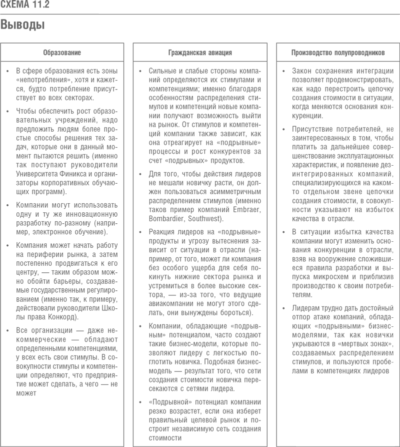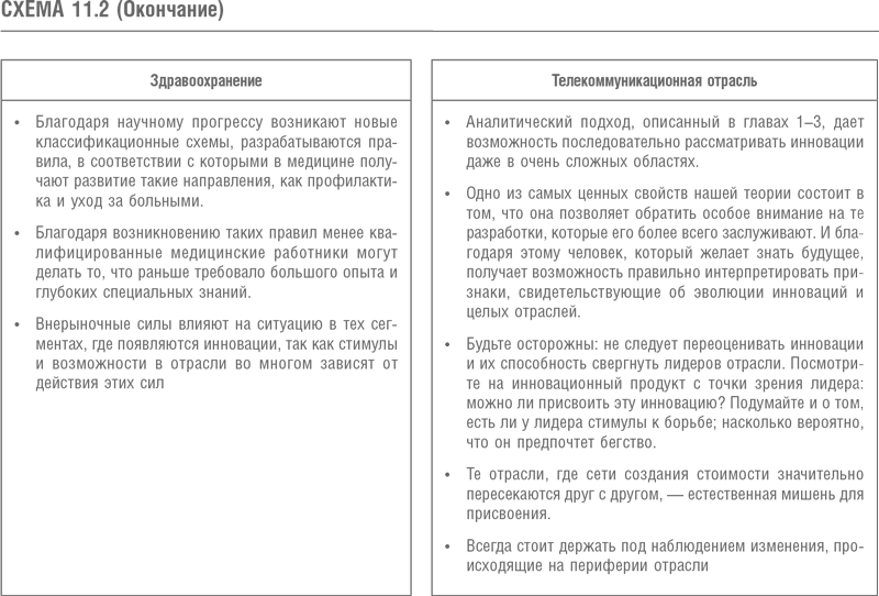 В главах 5–8, а также в главе 10 мы продемонстрировали, как с помощью нашего анализа можно прогнозировать развитие ряда отраслей: образования, гражданской авиации, производства полупроводников, здравоохранения и телекоммуникаций. В конце каждой главы мы давали дополнительные выводы общего характера, к которым мы пришли, анализируя ту или иную отрасль. На схеме 11.1 мы собрали все эти выводы вместе.