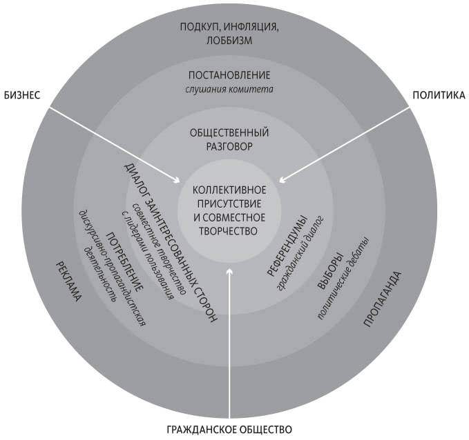Второй круг отражает суть интерактивного общения внутри современных демократических и экономических институтов и между ними.