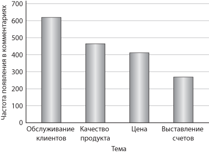 Некоторые компании используют автоматизированные программные инструменты для классификации и анализа многочисленных развернутых ответов, которые они получают. Это позволяет выявлять определенные темы или закономерности в большом объеме текста и других информационных материалов. Как и в случае классификации комментариев вручную, в результате применения таких автоматизированных инструментов получается диаграмма, отображающая относительную частоту встречаемости определенных вопросов или тем в ответах клиентов (рис. 6.2).