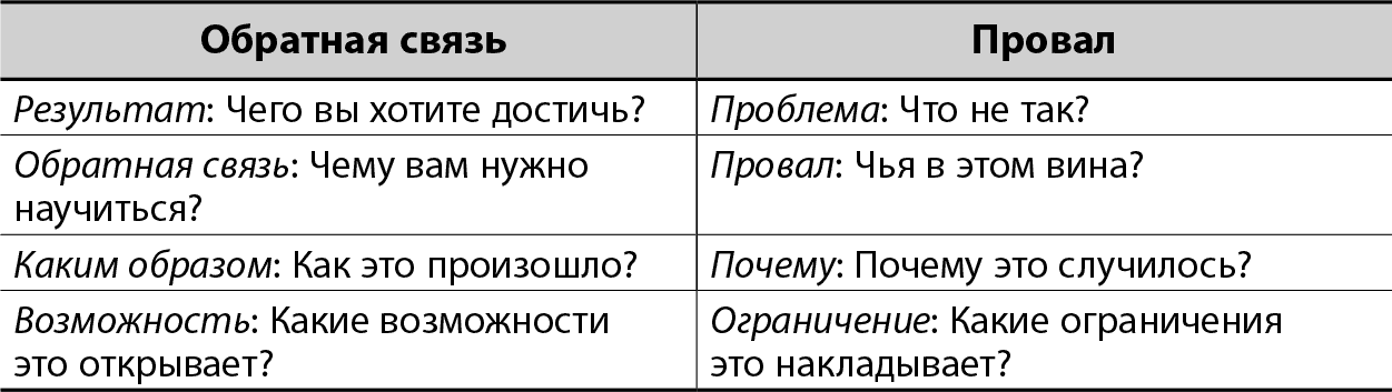 Теперь давайте посмотрим на стратегию обратной связи (левая колонка таблицы). Здесь мы видим знакомую модель четырех шагов, каждый из которых с помощью открытых вопросов ведет к совершенно противоположному и очень полезному результату.