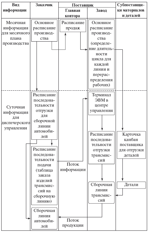 В обычной системе производства для этого составляется график производства конечных изделий, даются инструкции к различным операциям. Согласно соответствующим графикам производятся детали по методу «предшествующий участок поставляет детали для последующего». Однако при таком методе управления производством будет чрезвычайно трудно обеспечить производственный процесс, гибко реагирующий на изменения. Выполняя первое требование, компания сможет применить обратную схему – «вытягивание» последующим участком изготовленных изделий у предшествующего.