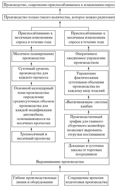 Существенно важным моментом в выравнивании производства является соблюдение основного правила MRP: «производить ровно столько, сколько можно сбыть». Даже после того как будет определен месячный график производства, компания будет вводить изменения в график производства различных комплектаций и модификаций изделий в соответствии с ежедневными заказами. Более того, даже в отношении общего объема выпуска, когда возникает необходимость следовать изменениям рыночных условий, компания должно пересматривать месячный график, с тем чтобы выровнять насколько возможно выпуск в соответствии с колебаниями рыночной конъюнктуры.