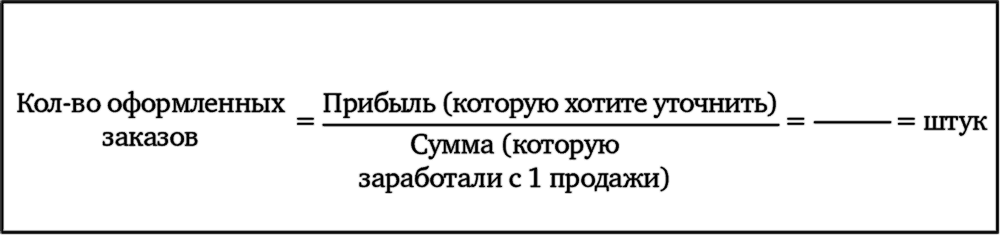 Предположим, вы разместили рекламу в паблике, вложили 1000 руб. и к вам пришло 10 человек. Получается, что цена 1 лида 100 руб. Вы смогли сделать из 10 лидов 2 продажи, это значит, что ваша конверсия 20 %. С одного заказа вы заработали 1000 руб. Посчитаем количество оформленных заказов, которые нам нужно для того, чтобы заработать 100 000 руб.