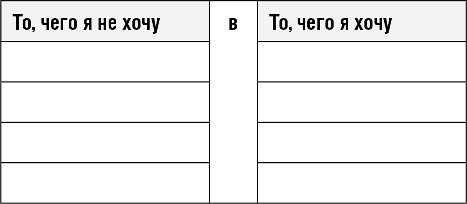 Вернитесь к списку № 1 и преобразуйте каждый отдельный пункт из отрицательного в положительный и мотивирующий так, чтобы он был примерно равнозначен прежнему. Например, в списке № 1 содержится пункт «долги». Вероятно, вместо долгов вам хотелось бы иметь приличный счет в банке – так и пометьте. Чтобы сформулировать новое понятие, вы каждый раз должны четко отвечать себе на вопрос: «Чего я хочу вместо этого?» По итогам данного задания вы дополняете список № 2, еще раз проверяете и, если нужно, исправляете расстановку приоритетов, а затем переходите к составлению окончательного сводного списка.