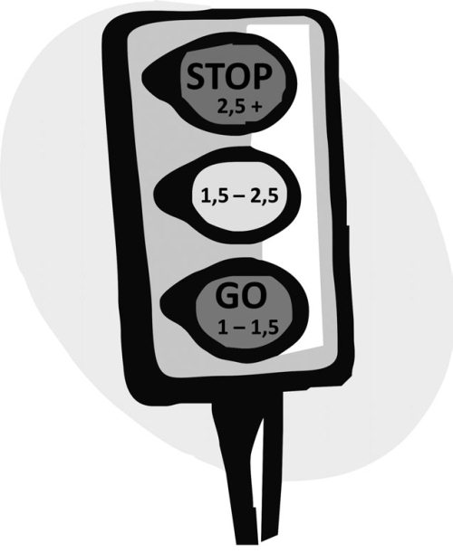 В качестве показателя успешной LIM-стратегии (см. LIM-светофор, рис. 6) можно обозначить, например, применительно к розничной торговле текстильными изделиями от 1 до 1,5 различных моделей на квадратный метр торговой площади. Также допустимо размещение от 1,5 до 2,5 моделей. Если количество моделей на квадратный метр товарной площади превышает 2,5, то высокого качества товарной выкладки достичь не получится.