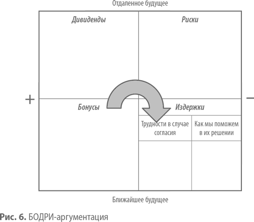 Правильная последовательность приведения аргументов выглядит так: «Бонусы», «Дивиденды», «Риски», «Издержки». Другими словами, ваш менеджер начинает с тех положительных моментов, которые клиент получит в ближайшее время, потом «рисует солнышко» – говорит о перспективах сотрудничества, потом «пугает» – показывает, к каким негативным последствиям может привести отказ от сотрудничества с вашей компанией, и в финале демонстрирует, как именно вы возьмете на себя головную боль клиента и поможете ему сделать первый шаг.