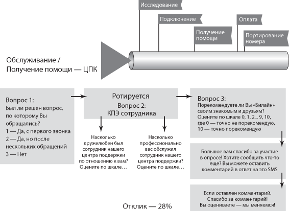 • Отклик в значительной степени зависит от построения фраз и логики задаваемых вопросов. Чем проще и конкретнее вопрос, тем легче на него ответить. Компания должна в двух словах объяснить, зачем она собирает обратную связь, а затем задать такие же емкие и лаконичные вопросы. Мы стремимся к тому, чтобы клиент отвечал на вопросы, а не спрашивал, зачем ему это. Однажды мы привлекли профессионального лингвиста к работе над нашим SMS-опросником. Он изменил формулировку приглашения к опросу: вместо фразы «Ответьте на несколько вопросов для улучшения “Билайн” он предложил использовать слова «Мы хотим улучшить нашу работу. Просим Вас ответить на 5 вопросов». Такое упрощение заметно повысило отклик на опрос.