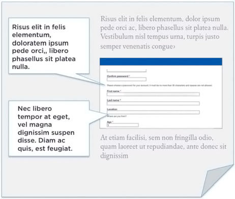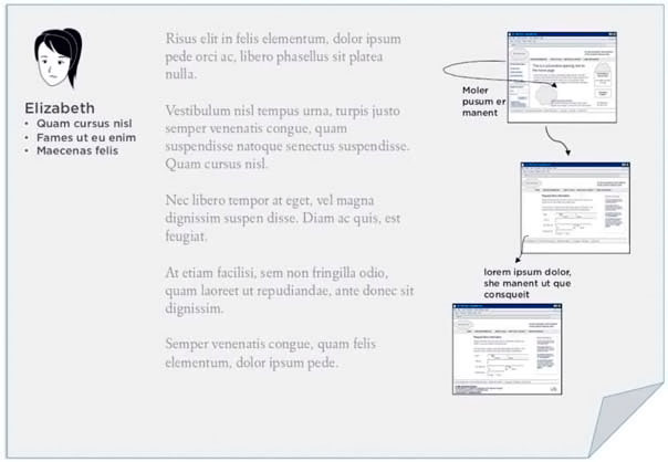 Вспомните историю о пользователях, которые ищут информацию о раке и не могут ее найти (см. главу 7). Скриншоты, описание схемы взаимодействия и цитаты помогли объяснить, как и почему люди терялись на сайте (рис. 15.12).