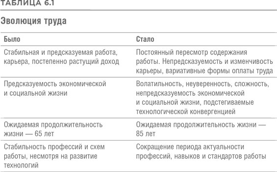 Сегодняшняя реальность разительно отличается от описанной выше картины. Волатильный, нестабильный, сложный и плохо предсказуемый современный мир развивается, опираясь на технологическую конвергенцию и глобальную прозрачность четвертой промышленной революции (см. главу 3). Эту реальность нетрудно опознать по решениям, принимаемым в сфере финансов, технологий, инноваций, работы с клиентами и рынками. Мы видим ее проявления в том, что ценность отдельных профессиональных навыков всё быстрее падает, а содержание деятельности непрерывно видоизменяется. Эти трансформации на рынке труда дополняются также и социальными переменами: повышается продолжительность жизни, крепнут глобальные виртуальные связи, расширяются социальные сети, растут киберугрозы и неравенство доходов[51]. Основные изменения перечислены в табл. 6.1.