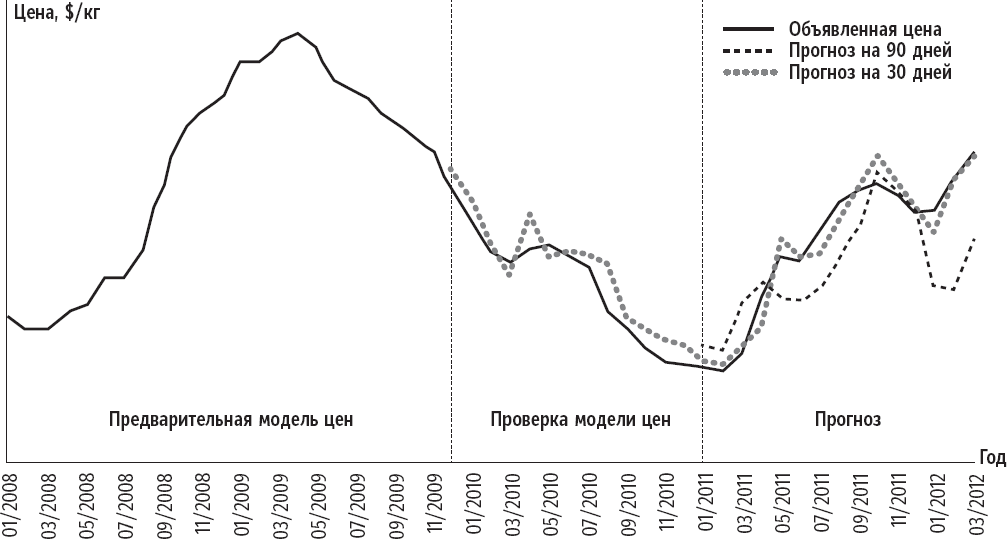 Крупная химическая компания столкнулась именно с этой проблемой. Ее торговые представители каждую неделю ездили к клиентам из текстильной промышленности и могли повлиять на время заказов. Совместно с химической компанией Simon-Kucher & Partners составила прогноз цен, основанный на данных о спросе и предложении, а также на оценке торговых представителей после каждого визита к клиентам. Прогнозы цен на 30 и 90 дней представлены на рис. 16.