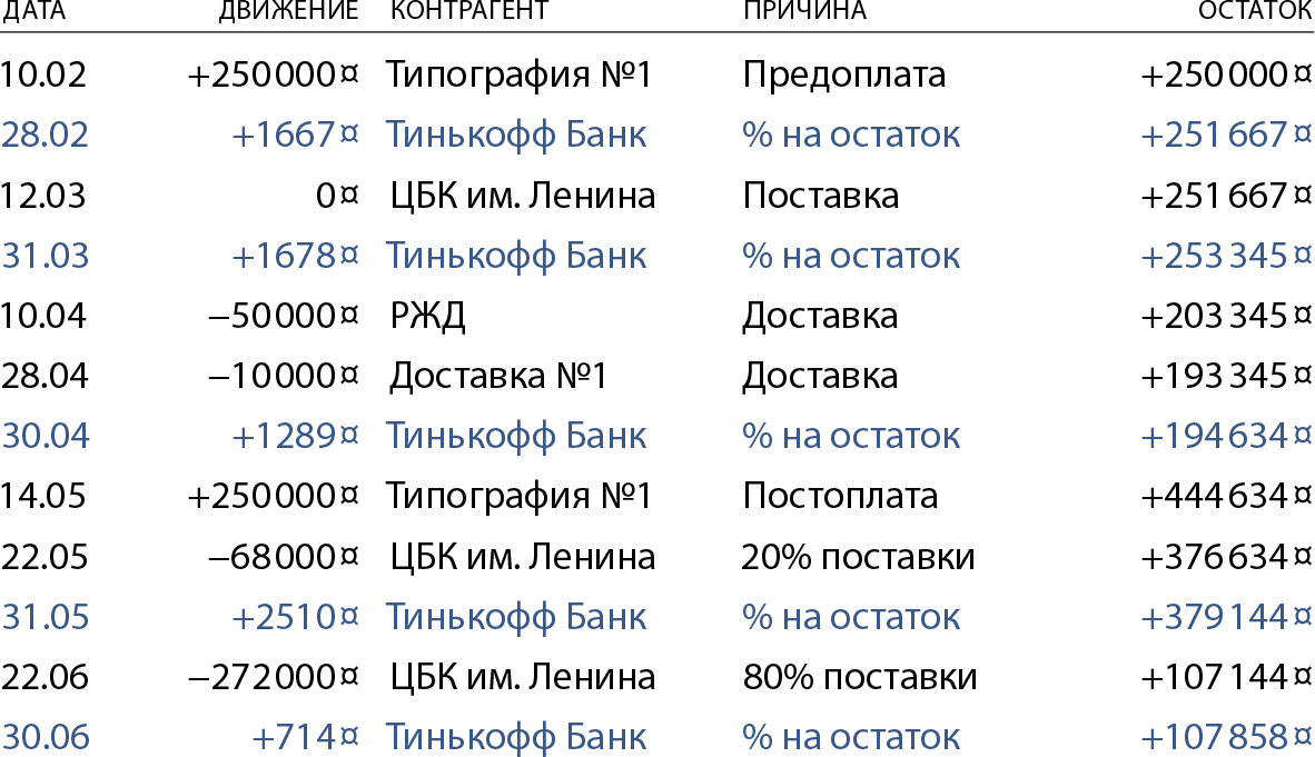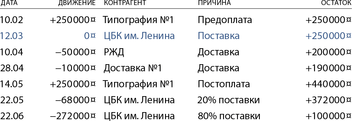 Вернемся к поставке бумаги. «Типография номер один» закупает у «Целлюлозы» бумагу на 500 000 рублей, делает предоплату 50 % в феврале и постоплату в мае. «Целлюлоза» идет к производителю бумаги ЦБК им. Ленина и тоже договаривается с ним о постоплате: