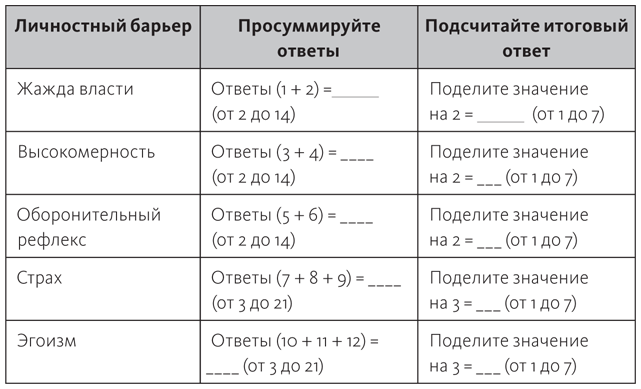 В нашем исследовании мы выявили пять серьезных личных барьеров (табл. 7.3)[278]. Вы можете оценить самого себя или кого-то другого, выполнив небольшое задание, представленное на табл. 7.4.