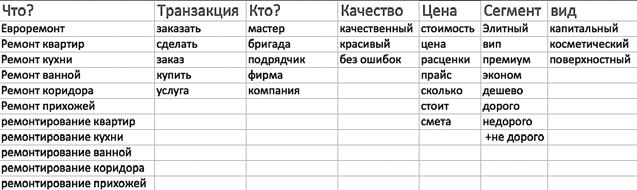 Следующий шаг очень простой – первую колонку по очереди сгенерировать со всеми остальными. Каждое слово из первой колонки с каждым словом из других колонок по отдельности. Сгенерировать можно с помощью функции «Сцепить» в Excel или сервисов, которые автоматически генерируют такие фразы (ссылка в приложении). В итоге получится несколько сотен двух– или трёхсловных словосочетаний. Это и есть второстепенные маски. Некоторые из них не будут иметь ни одного показа, но часто бывает, что те, о которых в жизни не догадался бы, дают большой охват пользователей.
