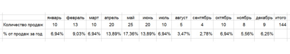 Нельзя забывать также про фактор сезонности. Если у вас уже есть информация о продажах какой-либо категории товара в прошлом году, то вы можете составить следующую табличку.