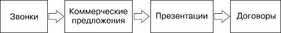 Наиболее известная модель применения процессных показателей в корпоративных продажах – воронка продаж. Это статистическая модель, устанавливающая зависимость между объемом активности на разных этапах процесса продаж. Предположим, что процесс поиска и привлечения клиентов в какой-либо абстрактной компании состоит из таких четырех этапов, как: звонки новым клиентам, подготовка коммерческих предложений, проведение торговых презентаций, заключение договора (рис. 5.4).