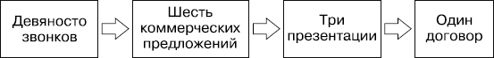Допустим, для заключения одного договора с клиентом необходимо провести в среднем три презентации. Почему так много? Потому, что не каждый клиент по итогам презентации соглашается заключить договор (часть отказывается). Мы также знаем, что торговые презентации являются следствием рассмотрения клиентами коммерческих предложений. Однако не всякое коммерческое предложение оказывается убедительным и способным склонить потенциального покупателя к проведению презентации (только каждое второе предложение оценивается положительно). Наконец, взглянем в самое начало процесса продаж. Сколько звонков клиентам надо совершить, чтобы инициировать запрос на коммерческое предложение? Скажем, необходимо сделать 15 звонков, чтобы выставить одно коммерческое предложение. Давайте посмотрим, что нам в конечном итоге требуется для получения желаемого договора с клиентом.