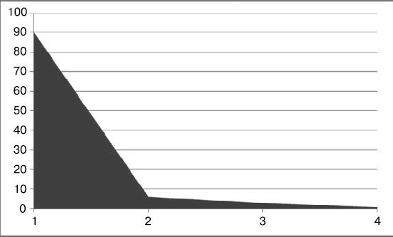 Статистика, представленная на рис. 5.5, не является ни эталонной, ни даже типовой. На самом деле конфигурация процесса продаж (набор и последовательность операций) и численная зависимость между отдельными этапами индивидуальны. Мы взяли гипотетические данные, однако они удовлетворяют закономерности, на которой базируется использование модели «воронка продаж». Если на основе статистики активности на разных этапах процесса продаж построить диаграмму, то наглядно видно, что объем действий на предыдущих этапах больше, чем на последующих (рис. 5.6). И это правило действует в большинстве случаев вне зависимости от конфигурации процесса продаж и конкретной статистики в конкретной компании.