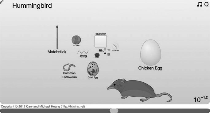 Но есть и люди, экспериментирующие с новыми формами. Например, показанный на рис. 29.1 сайт Scaleofuniverse.com позволяет исследовать целую вселенную информации, используя несколько кликов и режим прокрутки.