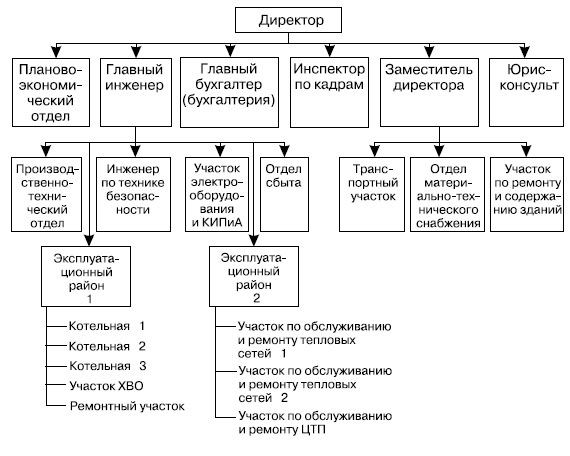 Организационная структура управления предприятием теплоснабжения состоит из органов управления протекающими технологическими процессами, связанными с выработкой и доставкой тепловой энергии потребителям, а также органов управления предприятием в целом и включает следующие основные подразделения: административно-управленческий аппарат, производственные отделы и службы, эксплуатационные районы. Именно эксплуатационные районы являются основными производственными подразделениями предприятия теплоснабжения.